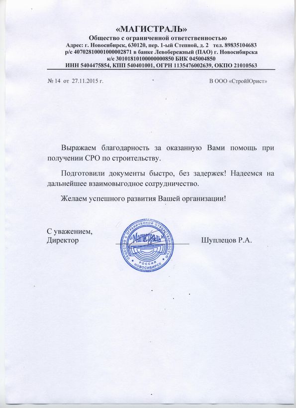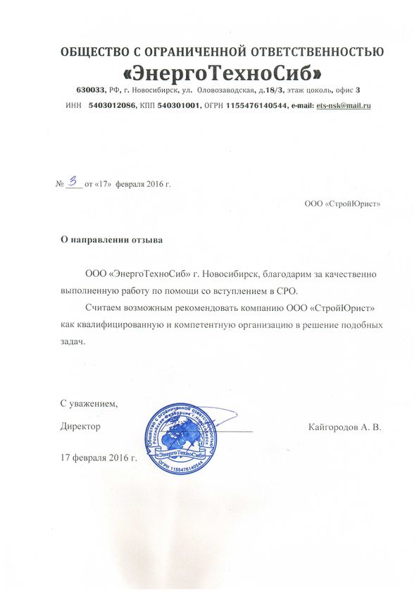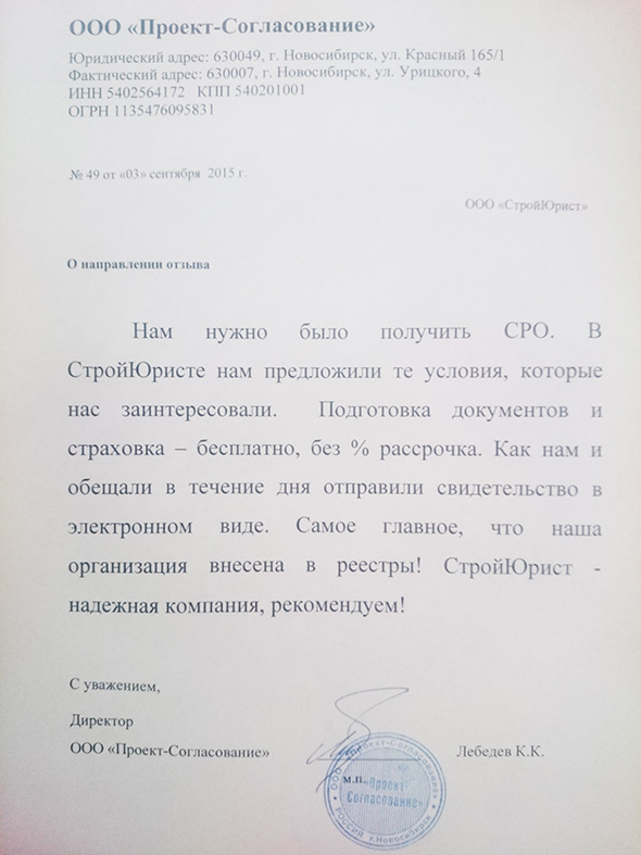 Отзывы клиентов "СтройЮрист" по вступлению в СРО в Элисте